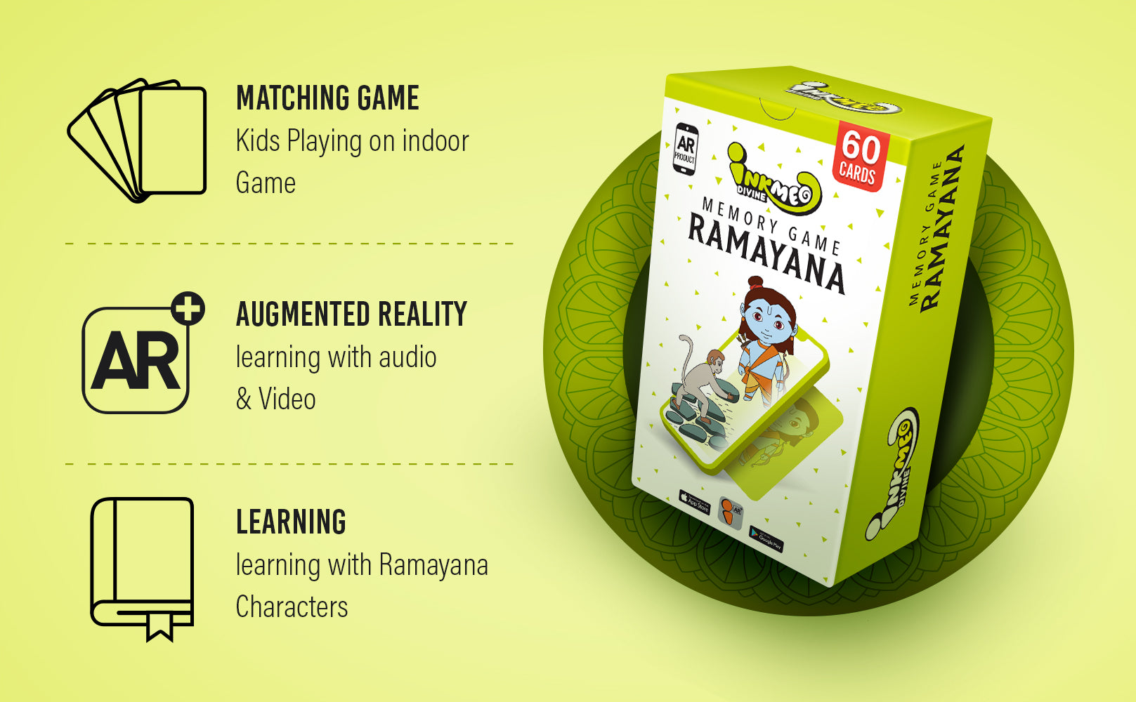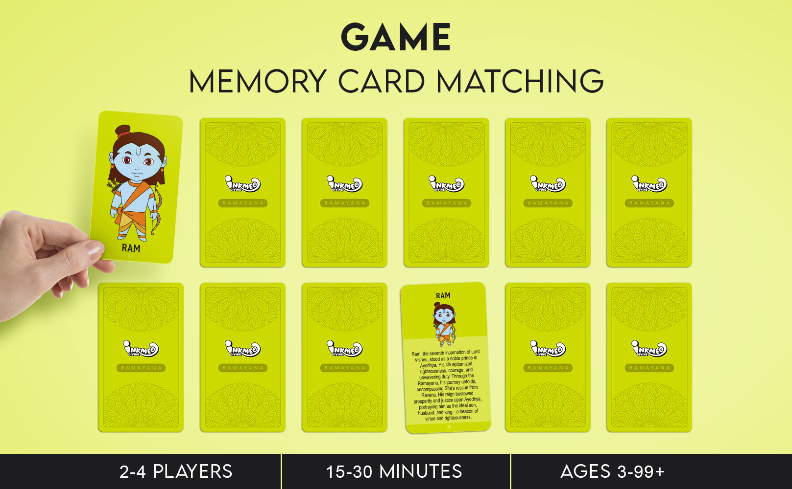 Introduce kids to the epic tales of the Ramayana with this interactive memory game! Featuring beautifully illustrated cards and Augmented Reality (AR) technology, this game enhances memory, focus, and cultural learning in a fun way. Scan the QR code to bring characters to life and explore engaging mythological stories.